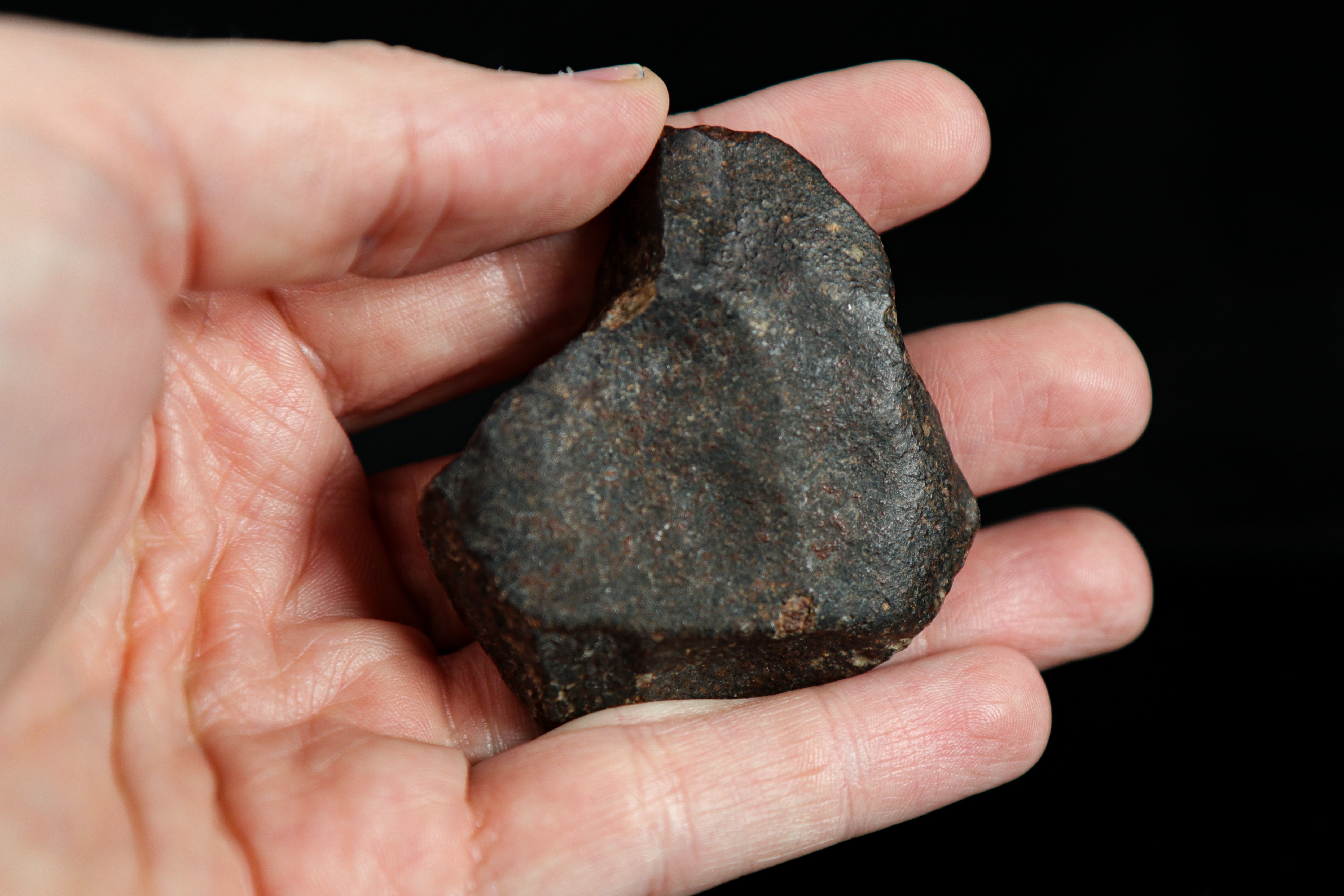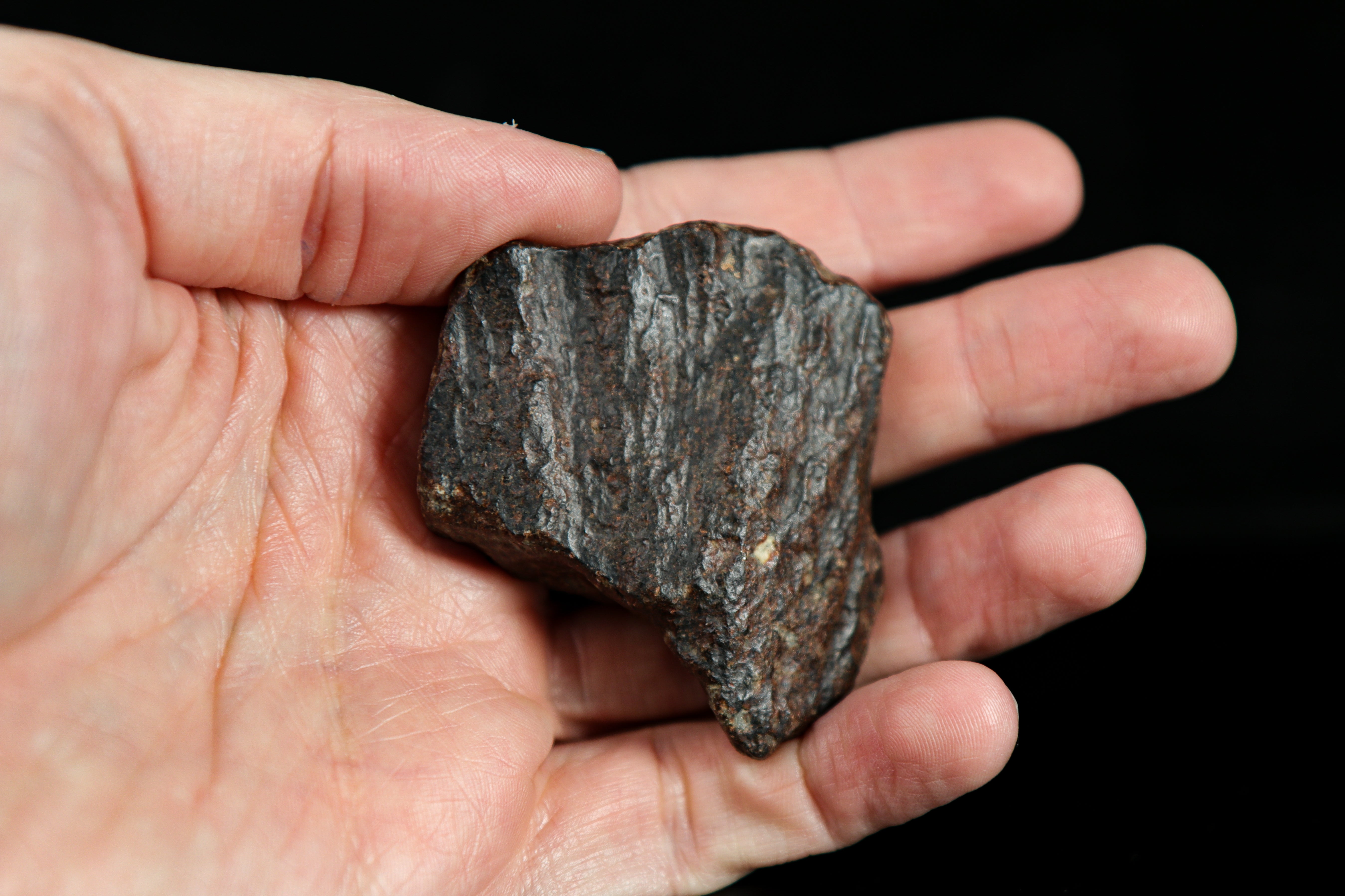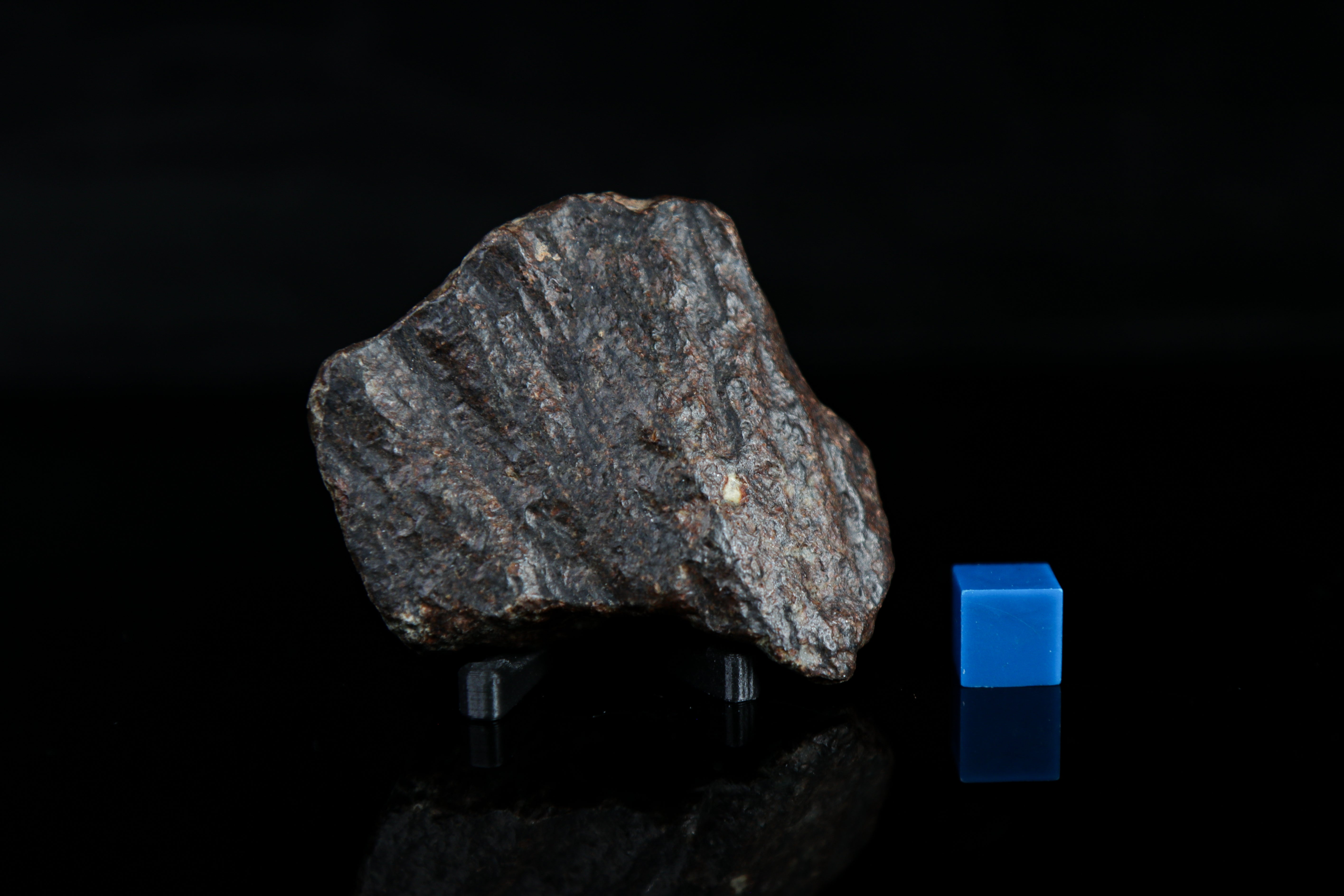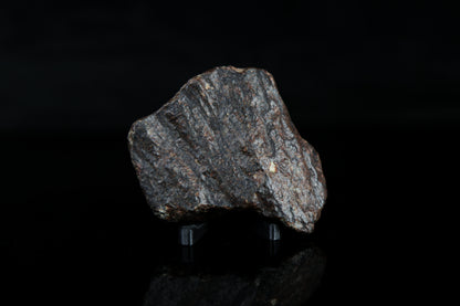 This 81.63 gram meteorite (chondrite) displays several unique features from its journey to Earth! The coloring is a dark desert varnish, with visible elongated regmaglypts and shear lines, giving some sense of flight orientation. Chondrules are externally visible, providing a window into minerals older than the Earth that were once molten in space before solidifying into their current form.