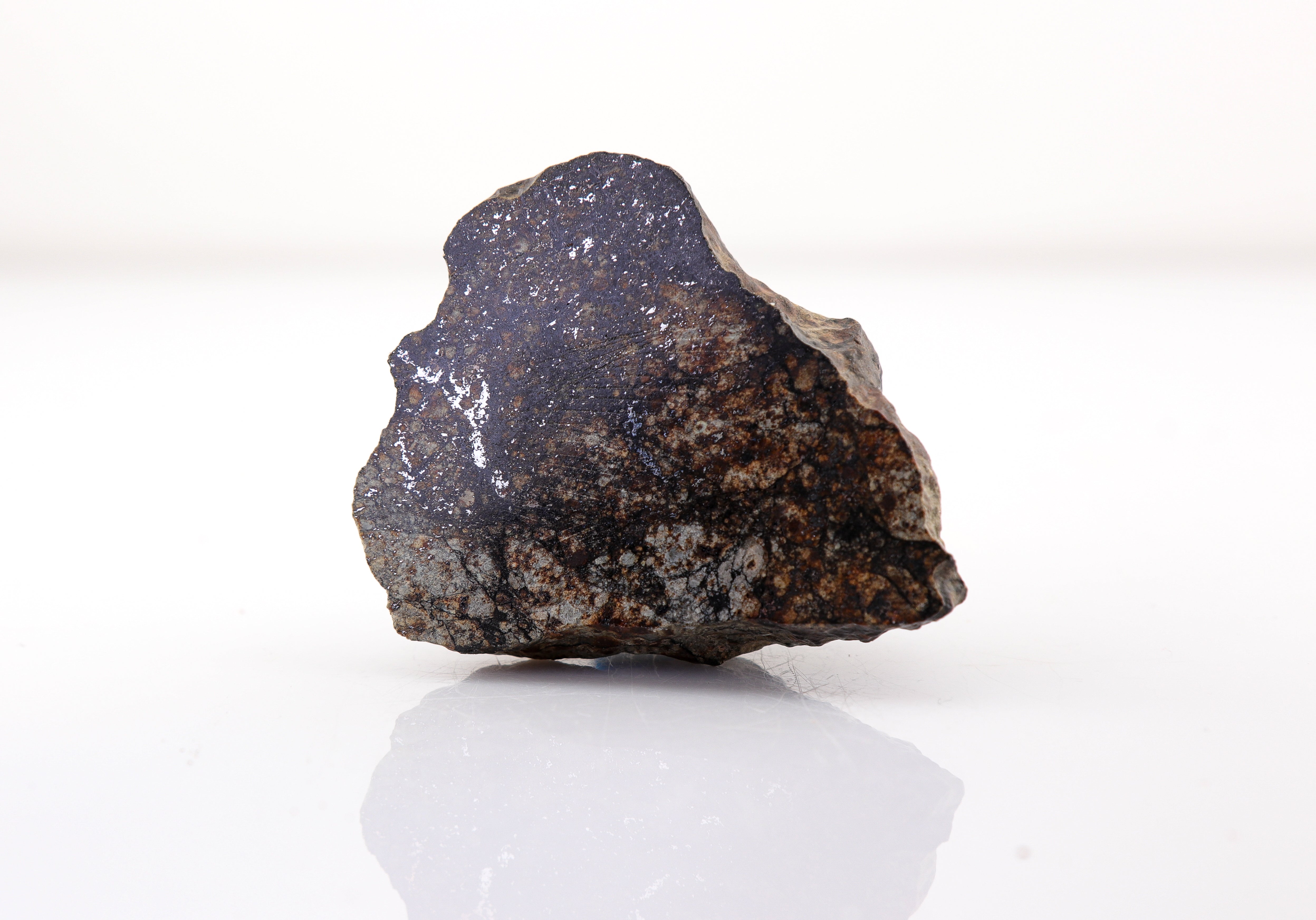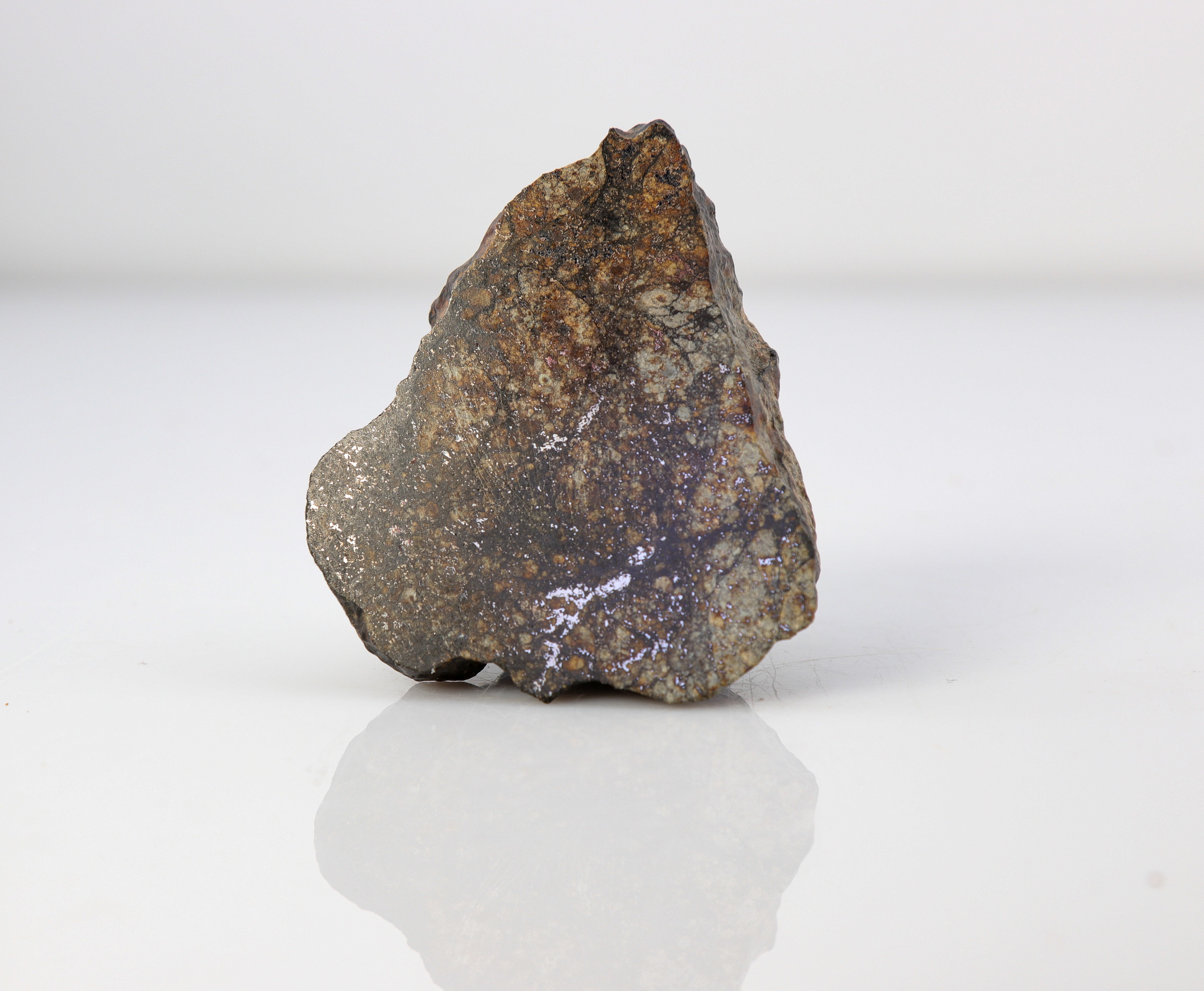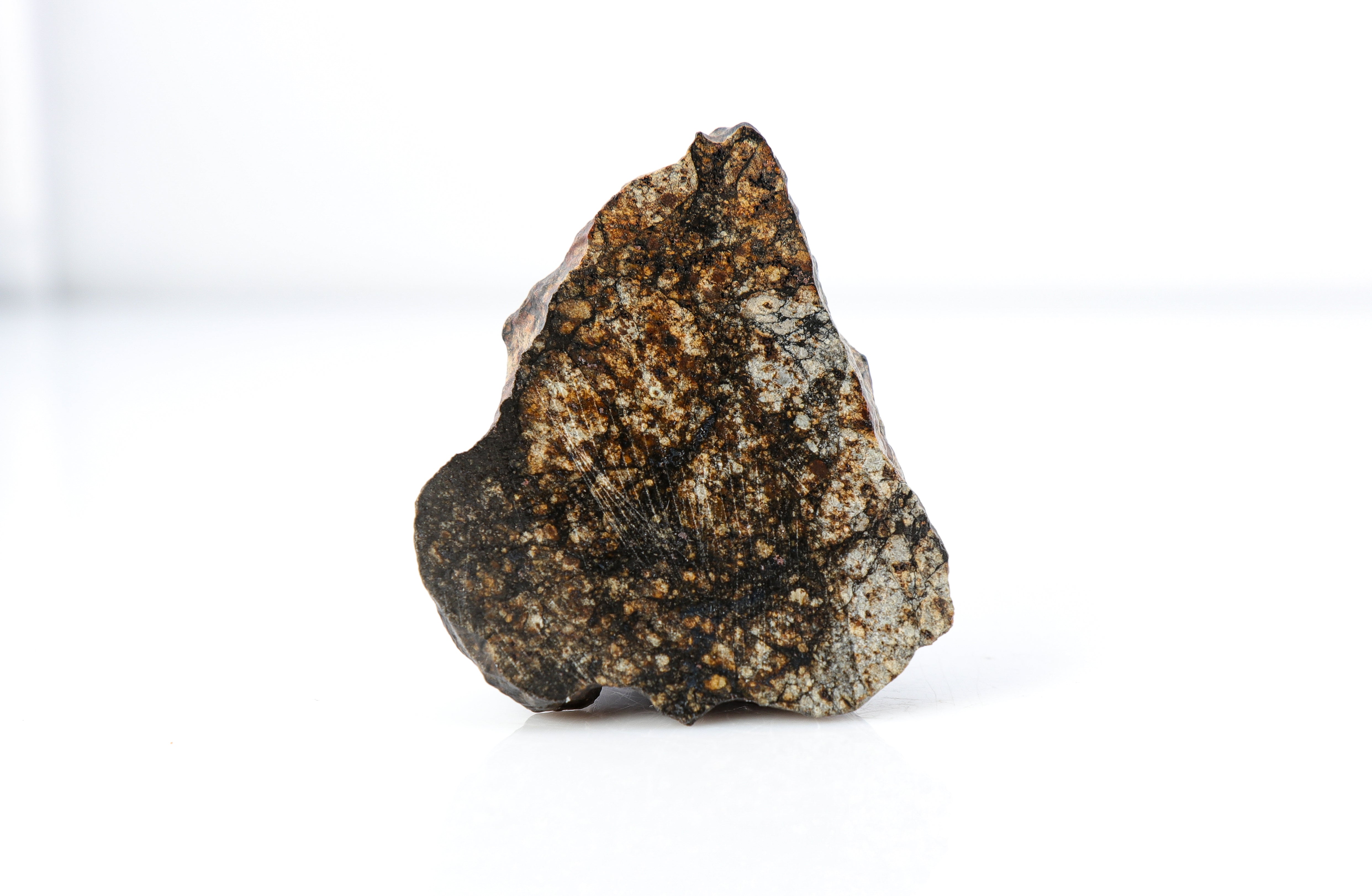 This 66.8 gram meteorite end cut is officially classified as NWA 14890 by the Meteoritical and Planetary Society. It is approximately 4.56 billion years old. The exterior features a pitted and multicolored texture that truly looks out of this world. The interior matrix displays a stunning contrast between the mineral breccia and dark contraction cracks formed by some sort of impact event. The abundance of free metal in the stone looks like an array of stars when it catches the light. This meteorite is a wonderful display piece that shows of many meteoritic characteristics.