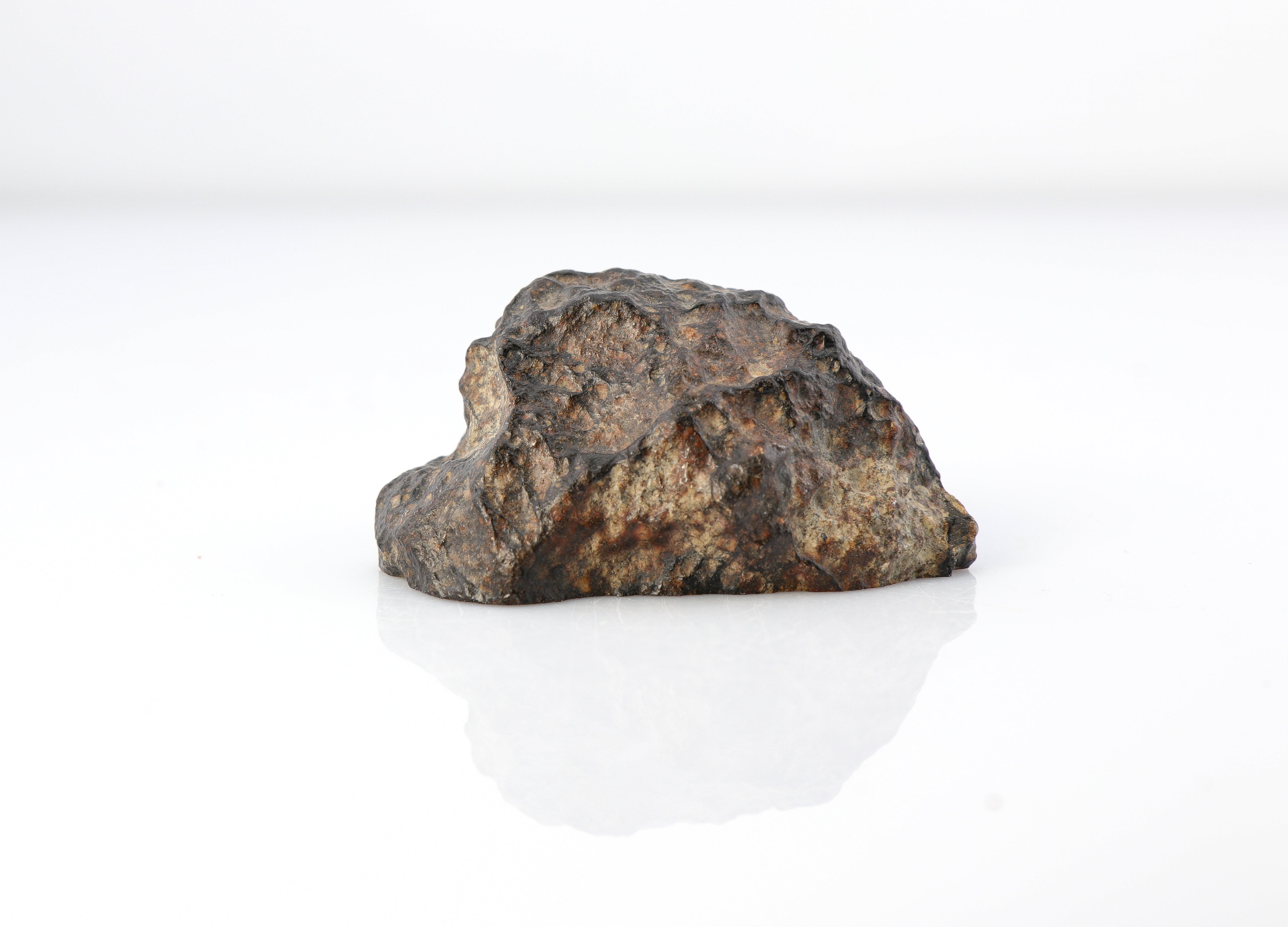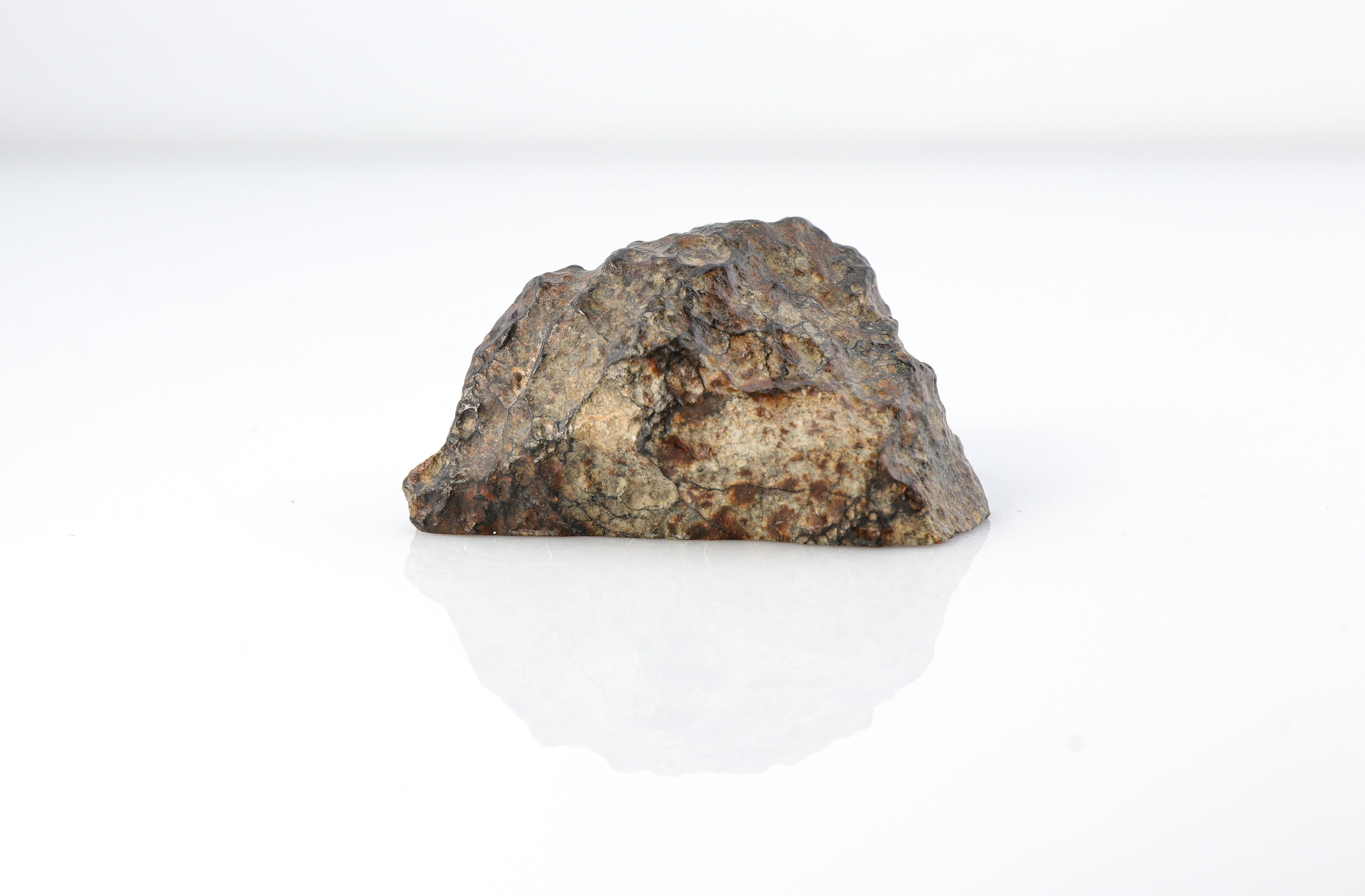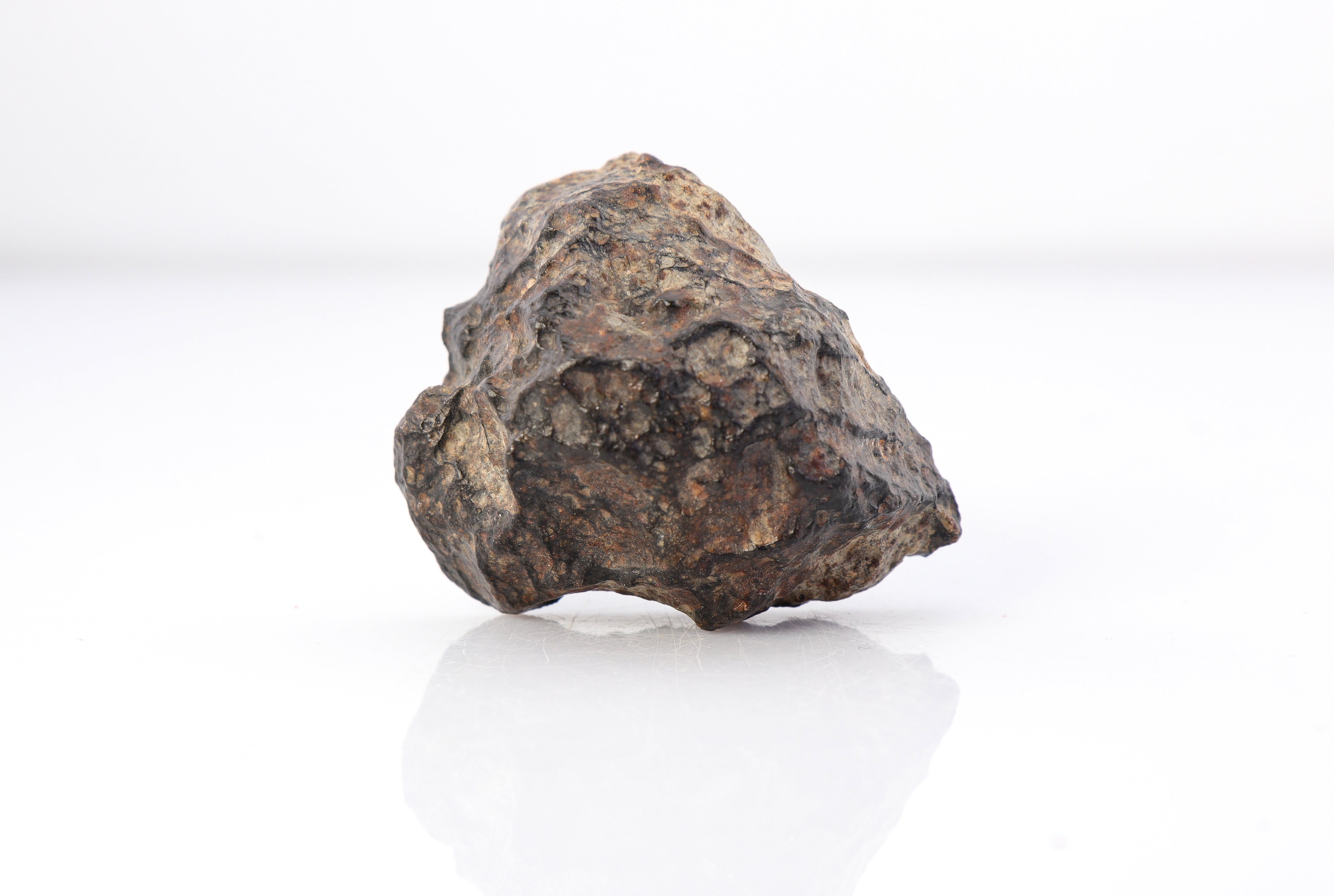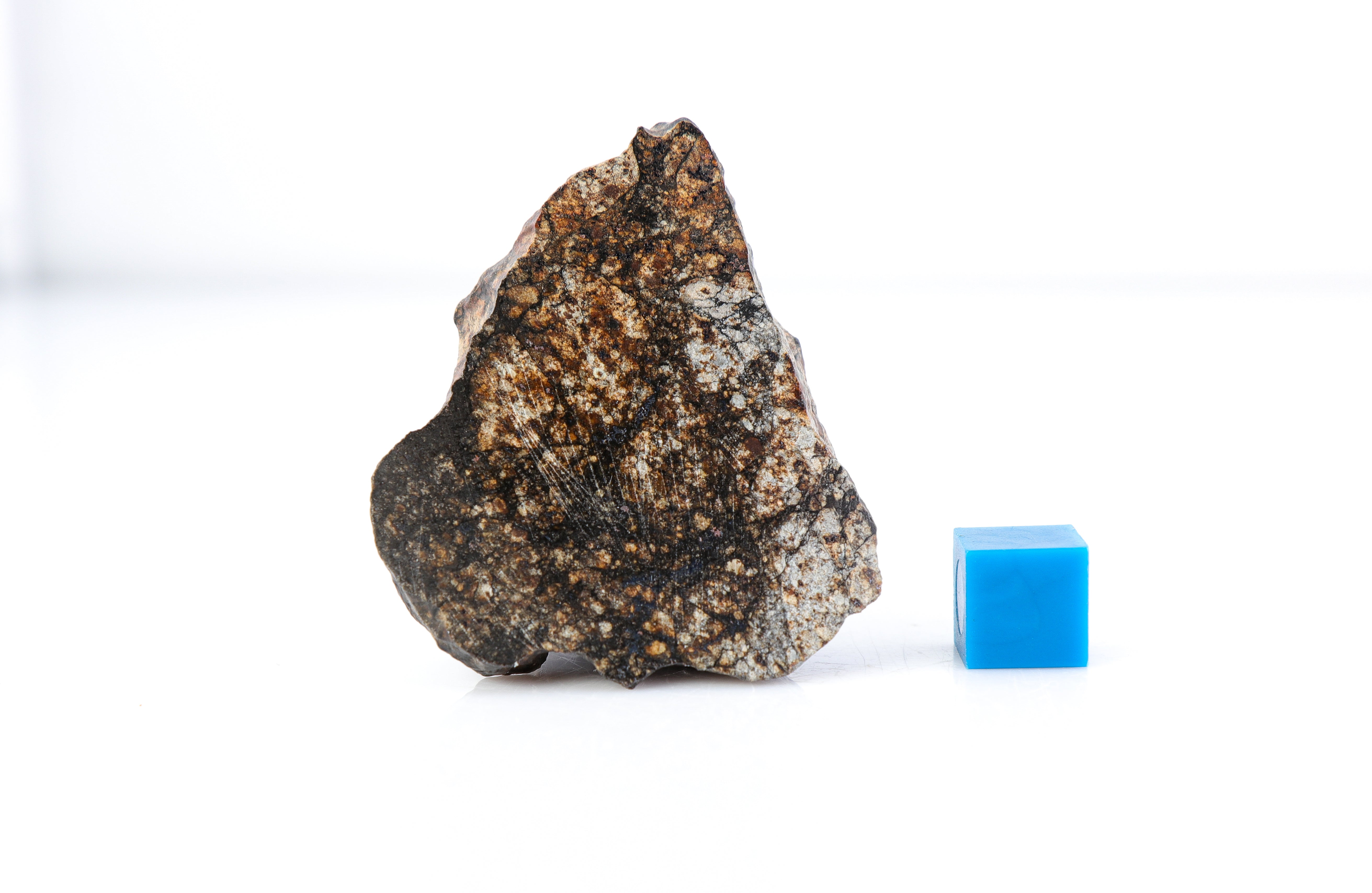 This 66.8 gram meteorite end cut is officially classified as NWA 14890 by the Meteoritical and Planetary Society. It is approximately 4.56 billion years old. The exterior features a pitted and multicolored texture that truly looks out of this world. The interior matrix displays a stunning contrast between the mineral breccia and dark contraction cracks formed by some sort of impact event. The abundance of free metal in the stone looks like an array of stars when it catches the light. This meteorite is a wonderful display piece that shows of many meteoritic characteristics.