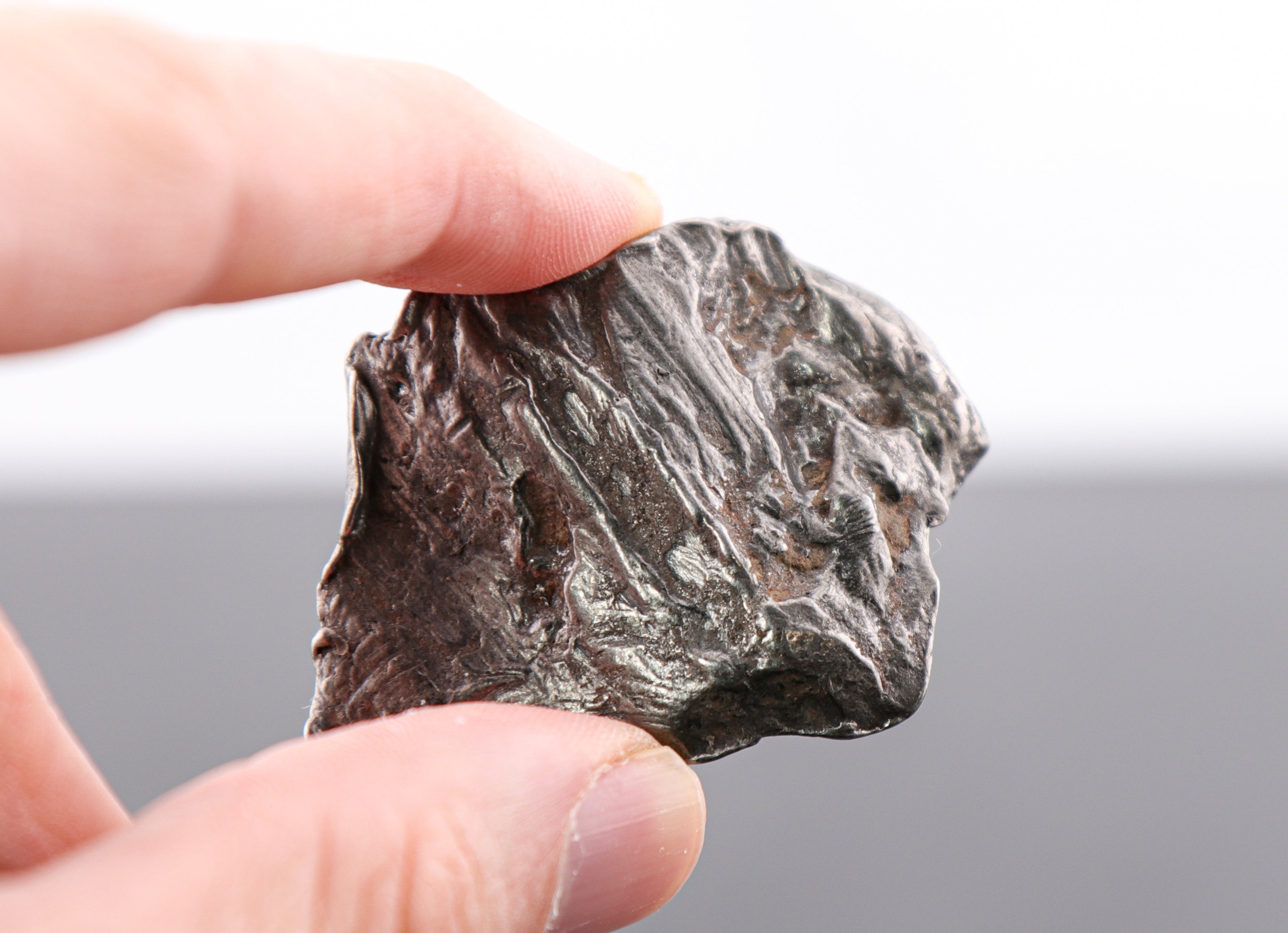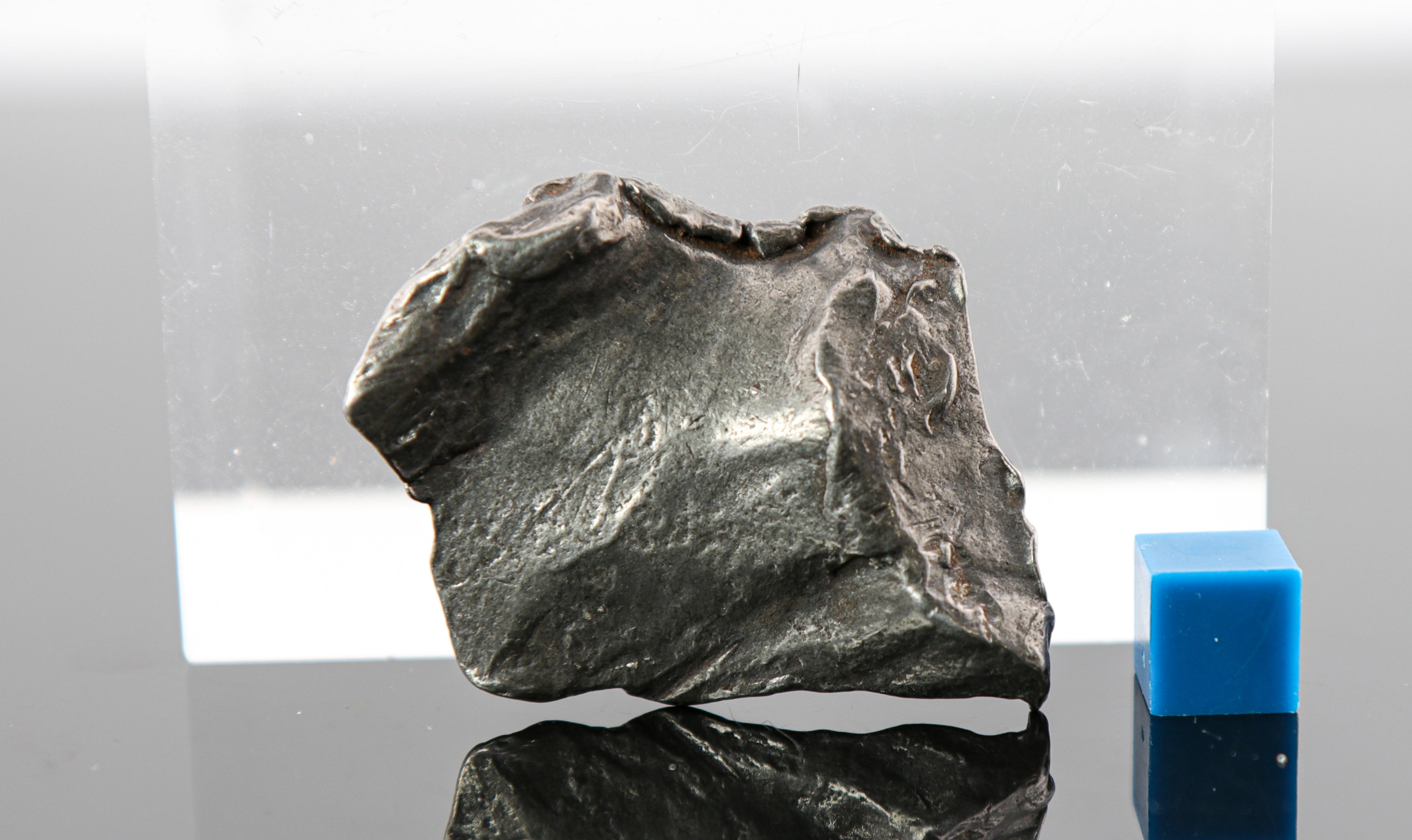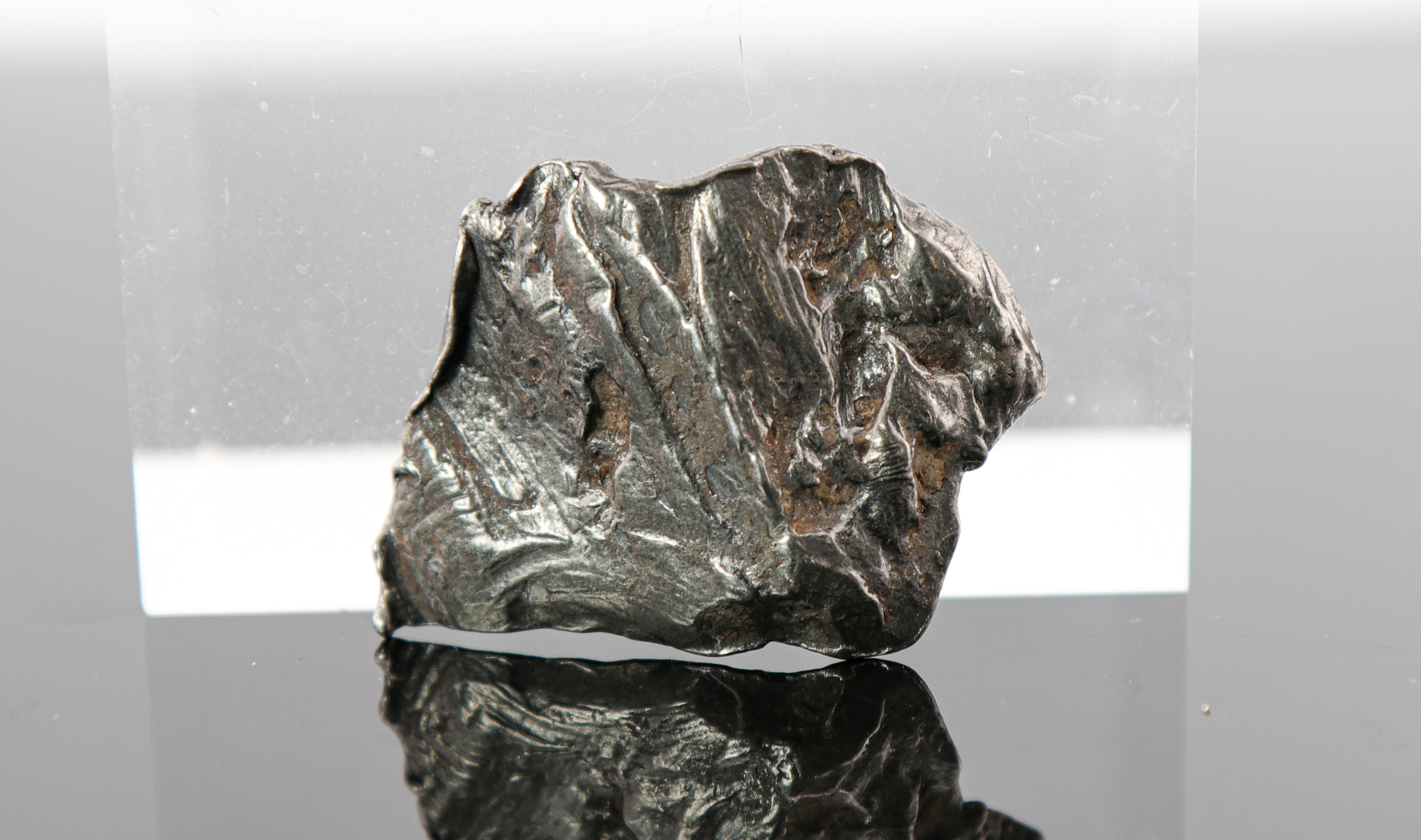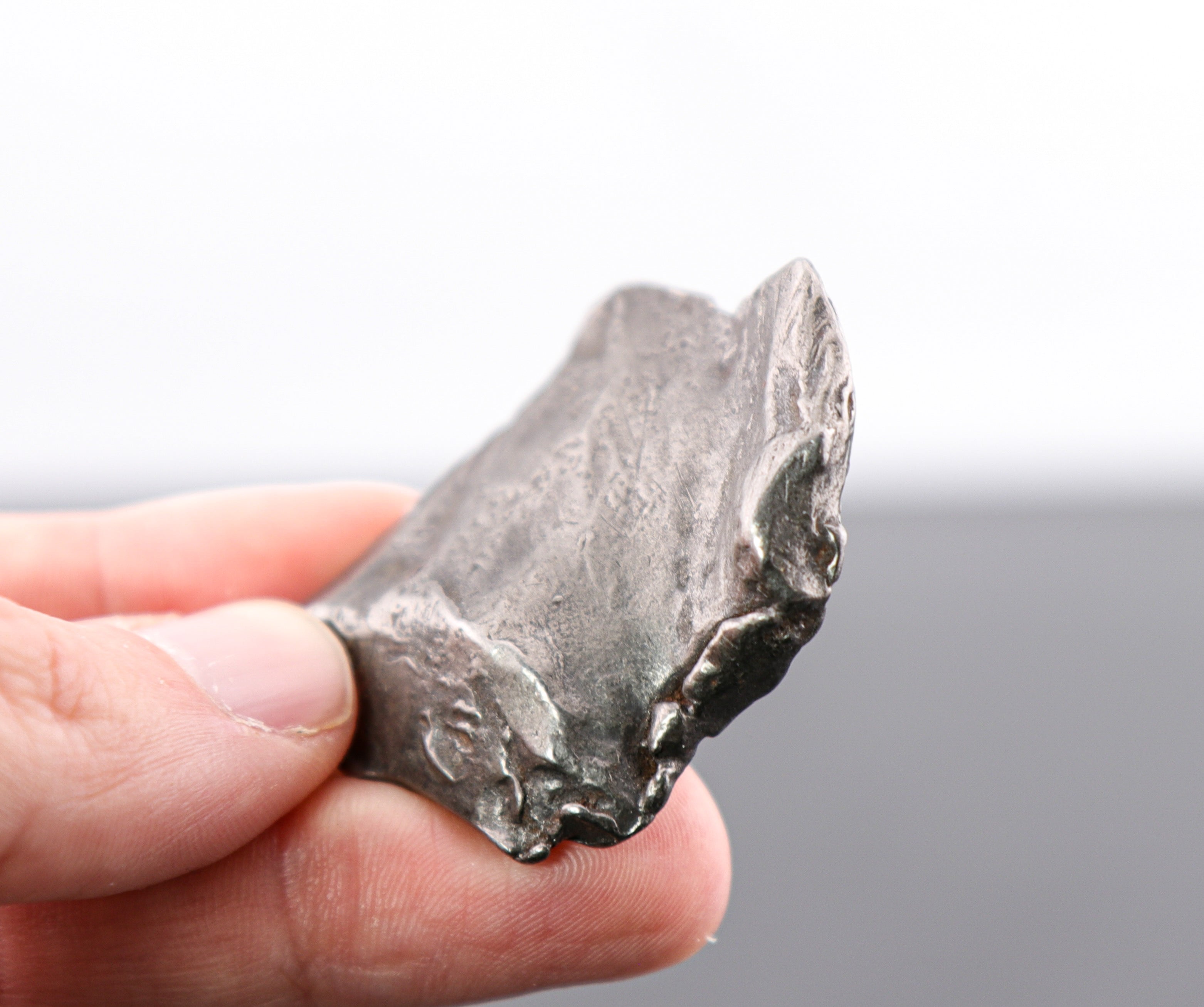 This 49.05 gram iron-nickel meteorite was discovered in Egypt in 2009. It is officially classified as Gebel Kamil by the International Society for Meteoritics and Planetary Sciences. It has been cleaned and features a metallic iron color. This meteorite has a an oriented shield shape acquired post atmospheric detonation as it fell to Earth. This piece potentially reformed after violently separating from a larger mass of the meteorite. Along with its one-of-a-kind shape, this meteorite also has visible rollover lipping.